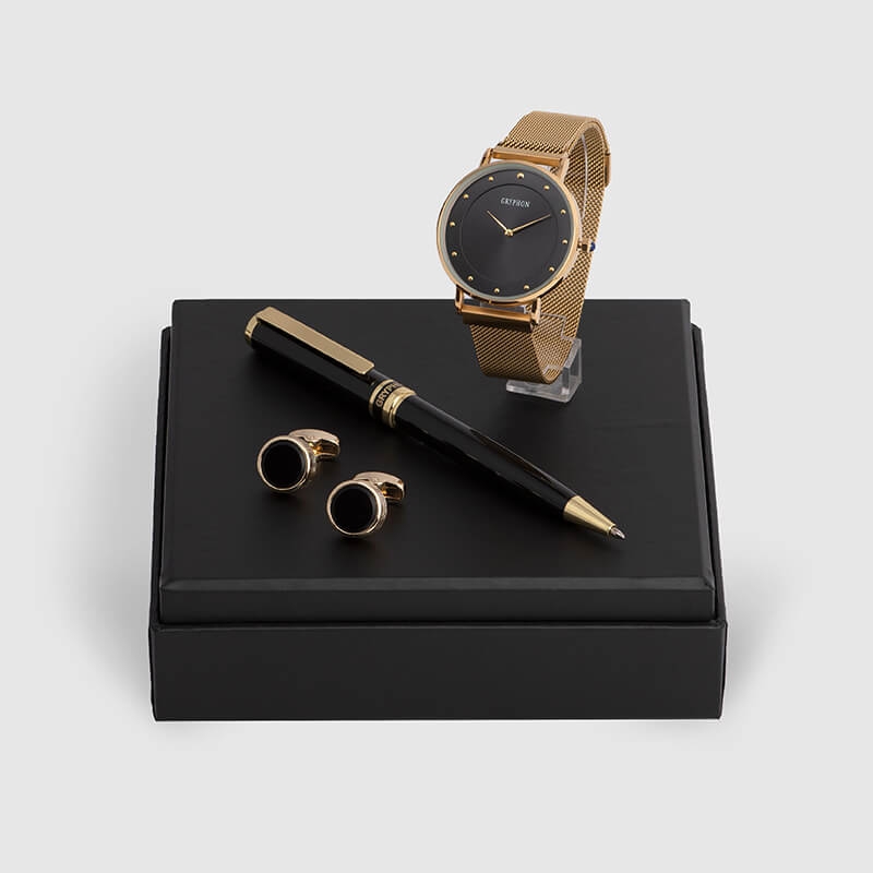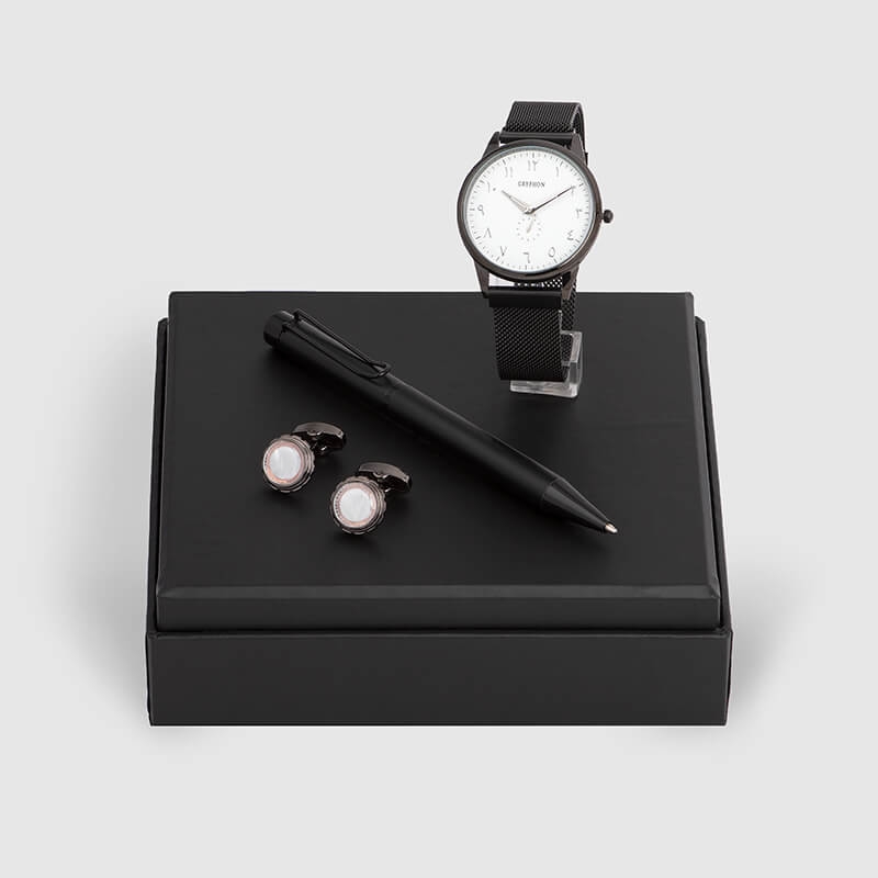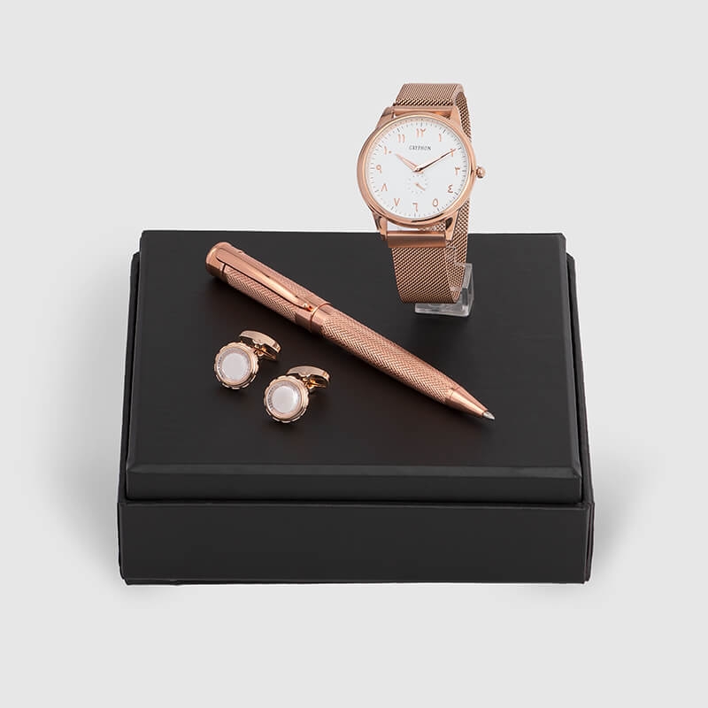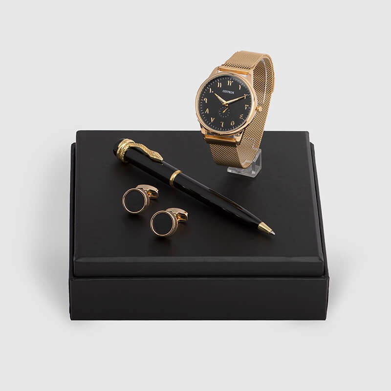 - تعتبر هدية شاملة ومميزة للرجال بما تشمله من قلم وكبك وساعة.